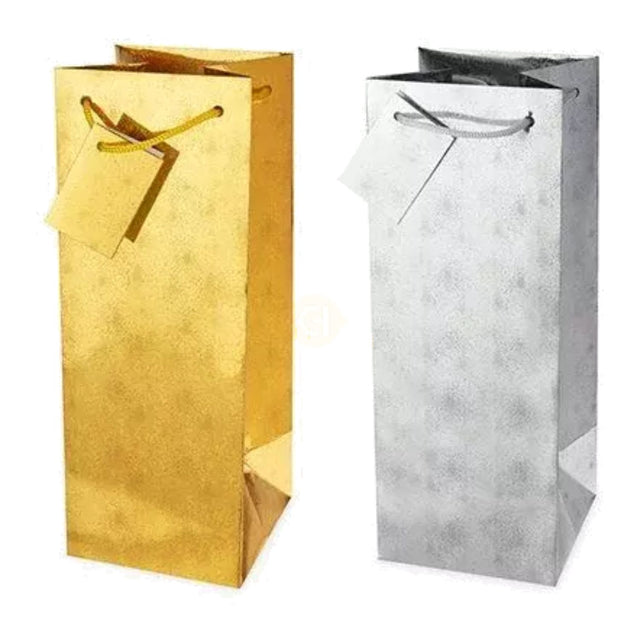 Light up the party with this assortment of firework-themed bottle bags. Metallic accents, ribbon handles, and gift tags included. Gold or Silver, random selection of one bag only. • Fits standard 1.5L bottles • 190 gsm metallic paper • Ribbon handles • Includes gift tag • DIM: 5.25” W X 14” H X 5.25” D