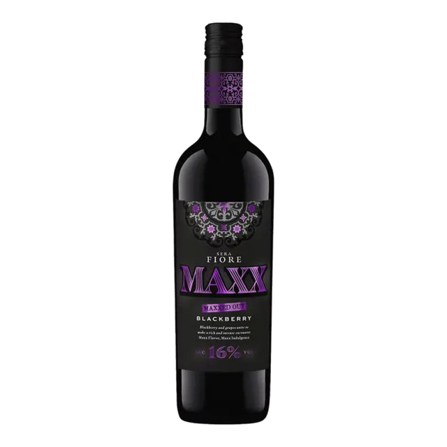 Sera Fiore Maxx Blackberry Wine pours in deep purple with a full-bodied sweetness that hits from the first sip. It delivers rich blackberry jam and ripe dark berries with just a hint of floral sweetness underneath—no surprise, no harsh tannins, just straightforward fruit flavor.
