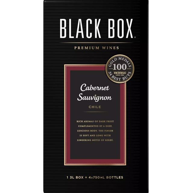Black Box Cabernet Sauvignon is a full-bodied, well-balanced red wine that comes in a sleek, portable box. Produced using Chile grapes, this wine has rich aromas of dark fruit that excite the senses and lead to notes of light oak. The finish is soft and long with lingering notes of berry. It makes the perfect pairing with foods like filet mignon, braised ribs and mushroom pizza. Black Box Cabernet Sauvignon is great for a variety of occasions, whether you're entertaining friends and family at an outdoor gathering or when you are unwinding after a long day of work. Each 3 L box contains about 4 (750 mL) bottles of wine with 13.5% alcohol by volume. The convenient box is shatterproof and resealable, making any outing easy. Plus, the wine stays fresh for up to 6 weeks after opening, giving you plenty of time to enjoy it. Black Box is the most awarded boxed wine. In addition to Cabernet Sauvignon, Black Box offers Pinot Noir, Merlot, and other varieties.