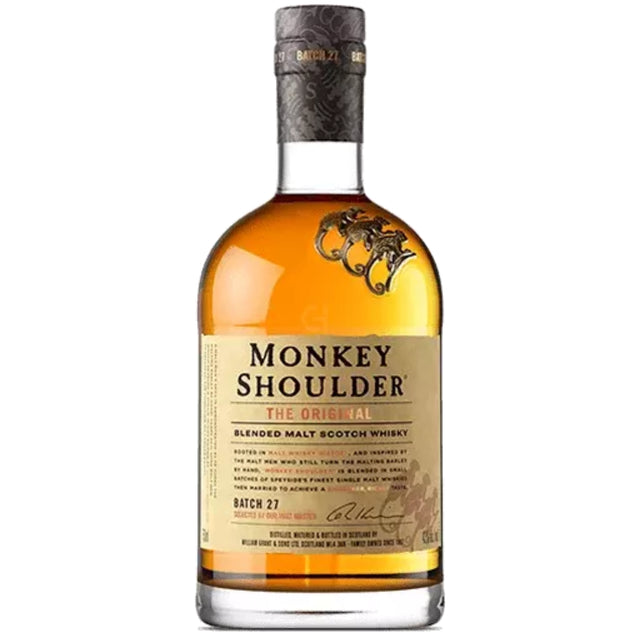Monkey Shoulder is a blend of Speyside single malt Scotch whiskies married together for flavor and consistency. The richness and vibrancy combine with fruity aromas and mellow vanilla, making it perfect for mixed drinks and cocktails. Monkey Shoulder casks are former bourbon casks, which add smooth vanilla flavors to this Scotch. It also has no grain whisky whatsoever anywhere in or even near the drink. It's barley all the way, folks. The name Monkey Shoulder might sound funny, but it has a history in whisky making. The maltmen who used to turn the barley would take long shifts, using their dominant arm significantly while working. At the end of the day, their shoulders would droop on one side, an ailment that became known as "Monkey Shoulder." Thankfully, the condition no longer exists, but the name lives on in our whisky. Monkey Shoulder is made for mixing and stands out most in mixed drinks, given its orange and vanilla flavors with a bit of spice. Refreshingly approachable, try it in easy-to-make cocktails like whisky and soda (“Monkey Splash”), whisky and ginger ale (“Ginger Monkey”), and the “Lazy Old Fashioned.” Check out for the recipes! Don't be a drunken monkey. Please drink responsibly.